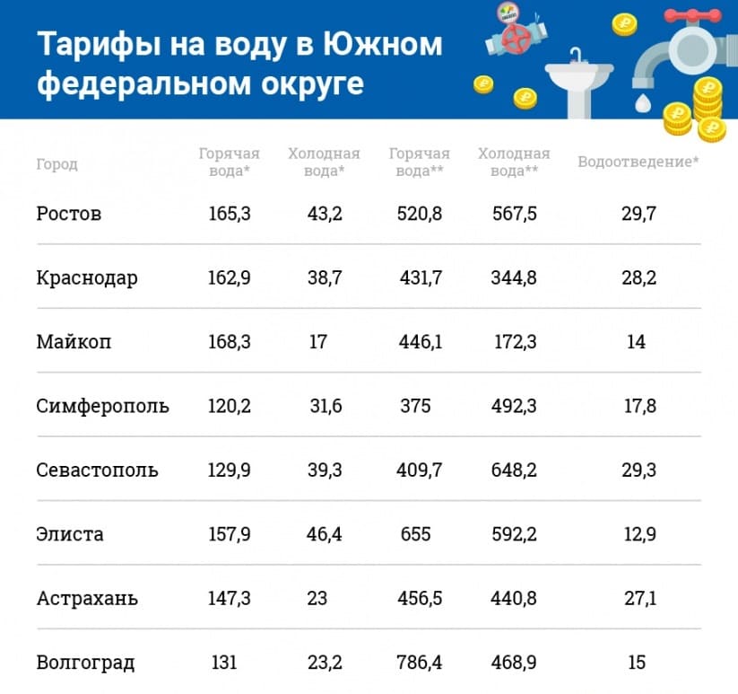 Самые высокие тарифы в Москве, Санкт-Петербурге, Ленинградской и Московской областях. В этих субъектах цена на 1 куб. м воды составляет 38,7 руб.