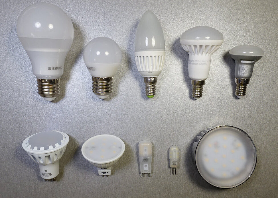 Обычно светодиодные лампы производятся в форме груши со стандартным цоколем E27. В таких случаях они немного больше обычных лампочек накаливания, так как корпус внутри должен вмещать блок питания, который изменяет напряжение с 220 на 12 В. Однако существует множество вариаций с другими типами цоколей, которые гораздо меньше по размеру. Для каждого потолочного светильника или люстры можно подобрать свой вариант.